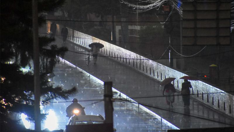 Kathmandu is dark due to cloud cover and thunder and hail are falling.